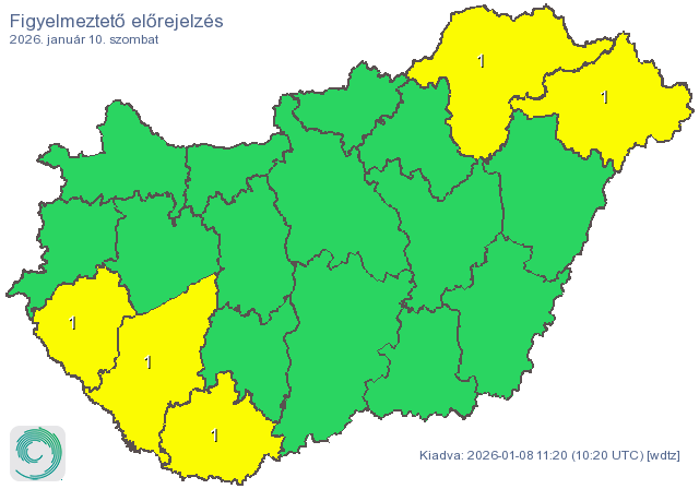 Pénteken a késő délelőtti, déli óráktól a délnyugati országrészben vegyes halmazállapotú csapadék (északabbra kisebb havazás, ~lepel-2 cm), kiemelten ónos eső várható. A tartós, több órás csapadékhullásból akár jelentős mennyiségű ónos eső is előfordulhat, így akár a legmagasabb fokú, piros riasztás is érvénybe léphet.